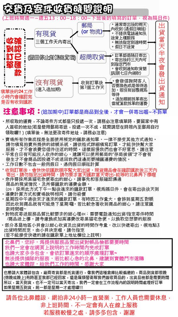 Ps3:請大家體諒,因為是每日定時去刷本子對帳,不可能北鼻每個人匯一次款就去刷一次, 出貨整理包裝對帳都需要時間,請大家體諒,我們希望給大家美好的出貨品質,也請大家給我們作業的時間,不接受要求我們當天填單就一定要當天寄出喔!!請大家包含,謝謝